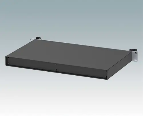 Modern aluminum 19" rack case with an anodised front panel and two ergonomic front panel handles. The case body consists of a solid wrap around top cover with removable base and rear panel. The base is pre-punched for fitting PCB mounting pillars or the accessory internal mounting plate. All parts are provided with M4 earth studs for electrical continuity.