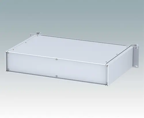Modern aluminum 19" rack case with an anodized front panel and two ergonomic front panel handles. The case body consists of two side panels with removable top, base and rear panel. The base is pre-punched for fitting PCB mounting pillars or the accessory internal mounting plate. All parts are provided with M4 earth studs for electrical continuity.