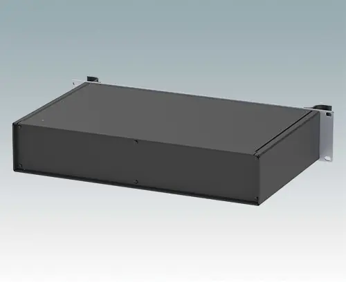 Modern aluminum 19" rack case with an anodized front panel and two ergonomic front panel handles. The case body consists of two side panels with removable top, base and rear panel. The base is pre-punched for fitting PCB mounting pillars or the accessory internal mounting plate. All parts are provided with M4 earth studs for electrical continuity.