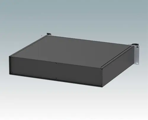 Modern aluminum 19" rack case with an anodized front panel and two ergonomic front panel handles. The case body consists of two side panels with removable top, base and rear panel. The base is pre-punched for fitting PCB mounting pillars or the accessory internal mounting plate. All parts are provided with M4 earth studs for electrical continuity.