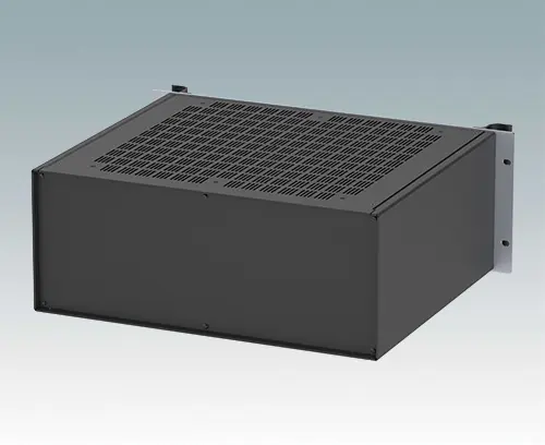 Modern ventilated aluminum 19" rack case with an anodized front panel and two ergonomic front panel handles. The case body consists of two side panels with removable top, base and rear panel. The base is pre-punched for fitting PCB mounting pillars or the accessory internal mounting plate. All parts are provided with M4 earth studs for electrical continuity.