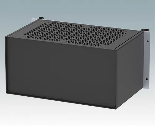Modern aluminum 19" rack case with an anodized front panel and two ergonomic front panel handles. The case body consists of two side panels with removable top, base and rear panel. The base is pre-punched for fitting PCB mounting pillars or the accessory internal mounting plate. All parts are provided with M4 earth studs for electrical continuity.