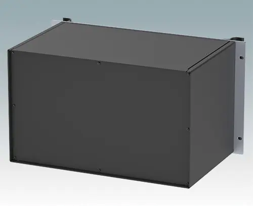 Modern aluminum 19" rack case with an anodized front panel and two ergonomic front panel handles. The case body consists of two side panels with removable top, base and rear panel. The base is pre-punched for fitting PCB mounting pillars or the accessory internal mounting plate. All parts are provided with M4 earth studs for electrical continuity.