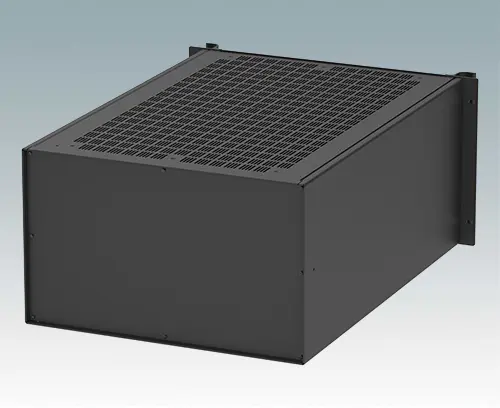 Modern ventilated aluminium 19" rack case, 24" deep, with a painted black front panel and two ergonomic front panel handles. The case body consists of two side panels with removable top, base and rear panel. The base is pre-punched for fitting PCB mounting pillars or the accessory internal mounting plate. All parts are provided with M4 earth studs for electrical continuity.