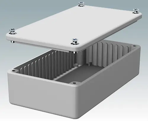 Highly durable and shock resistant diecast enclosure. Vertical guides and stand-offs provided in the base for locating PCBs and assemblies. IP 65 (NEMA 4) sealing gasket and external mounting brackets available as accessories.