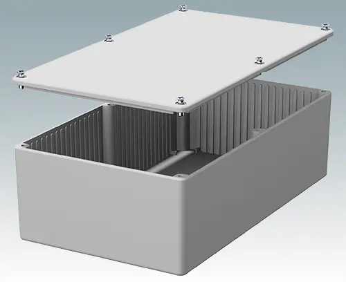 Highly durable and shock resistant diecast enclosure. Vertical guides and stand-offs provided in the base for locating PCBs and assemblies. IP 65 (NEMA 4) sealing gasket and external mounting brackets available as accessories.