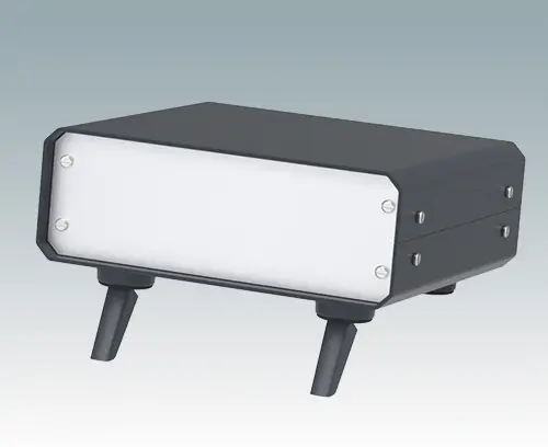 Stylish and modern case feet with tilt legs for canting. Universal design for fitting to any type of plastic or metal enclosure. Four part assembly with foot body, push-in anti-skid TPE pad, tilt leg with 120° rotation and self-tapping screw. Max. enclosure wall thickness 0.12" (3 mm) with screws provided (alternative screws can be supplied for larger wall thicknesses). Simply drill three holes per foot in the enclosure panel - see drawings for drilling details.