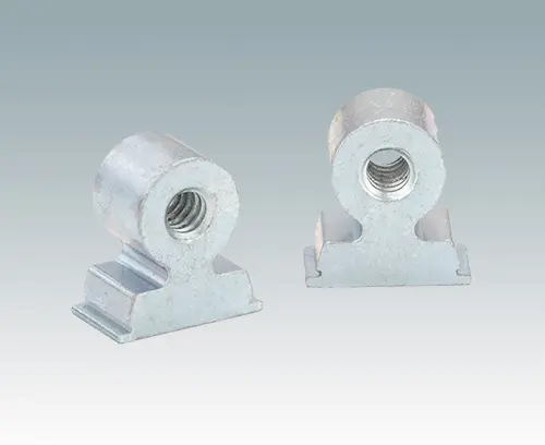 Threaded right angle fastener which is press fitted into a rectangular hole in the panel.