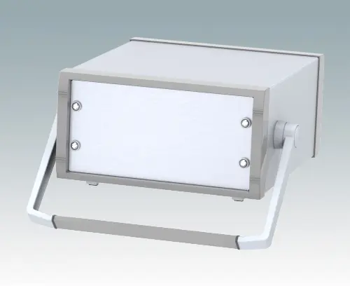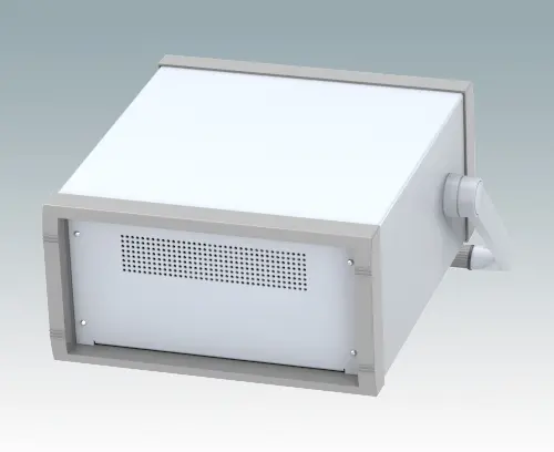Stylish 10.5" instrument case for mounting 3U subracks, chassis or front panels. Portable version with metal handle/bail arm. Robust design with two die cast front bezels and fabricated case body. The base panel and rear panel are ventilated. Internal chassis runners support the equipment. Supplied with pre-fitted with ABS tilt feet.