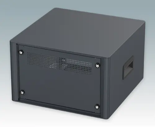 Modern and highly attractive 10.5" instrument enclosure for mounting 4U subracks (42HP), chassis or front panels. Conforms to DIN 41494 & IEC 297. Stylish front and rear bezels are fitted to the aluminum case body. Clip-on trims at the front and rear hide the assembly screws giving a very professional appearance. All case panels fitted with M4 threaded pillars for earth connection. The case is supplied with a rear panel, two ABS side handles and four ABS non-slip feet. Ventilation slots are provided in the base and rear panel. Internal chassis runners support the 10.5" equipment.