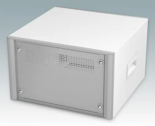 Modern and highly attractive 10.5" instrument enclosure for mounting 4U subracks (42HP), chassis or front panels. Conforms to DIN 41494 & IEC 297. Stylish front and rear bezels are fitted to the aluminum case body. Clip-on trims at the front and rear hide the assembly screws giving a very professional appearance. All case panels fitted with M4 threaded pillars for earth connection. The case is supplied with a rear panel, two ABS side handles and four ABS non-slip feet. Ventilation slots are provided in the base and rear panel. Internal chassis runners support the 10.5" equipment.