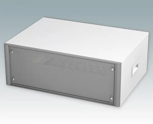 Modern and highly attractive 19" instrument enclosure for mounting 4U subracks (84HP), chassis or front panels. Conforms to DIN 41494 & IEC 297-1. Stylish front and rear bezels are fitted to the aluminum case body. Clip-on trims at the front and rear hide the assembly screws giving a very professional appearance. All case panels fitted with M4 threaded pillars for earth connection.