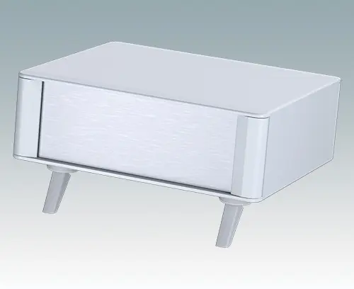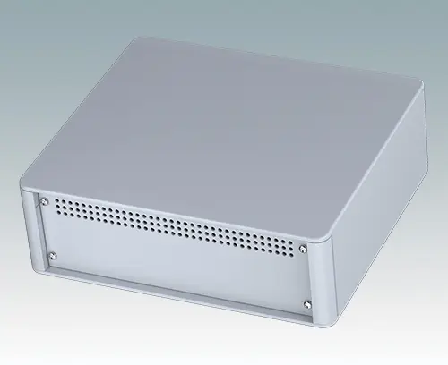 Modern and highly attractive instrument enclosure for desktop electronics. Stylish front and rear bezels are fitted to the aluminum case body. Clip-on trims at the front and rear hide the assembly screws and front panel screws, giving a very professional appearance. The pre-assembled internal chassis is supplied with four M3 PCB mounting pillars fitted in the base. The internal chassis can also be fitted with 3 slide-in PCBs using the accessory snap-in guide M6490020 (order 2 guides per PCB). The case is supplied with a rear panel and four ABS feet with tilt legs. Ventilation slots are provided in the base and rear panel. Order front panels separately.