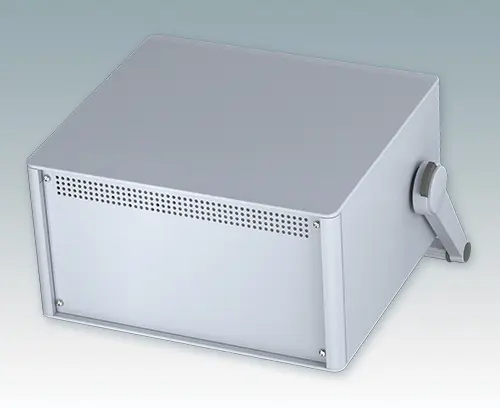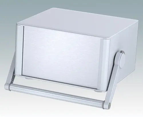Modern and highly attractive instrument enclosure with handle/bail arm for desktop and portable electronics. Stylish front and rear bezels are fitted to the aluminum case body. Clip-on trims at the front and rear hide the assembly screws and front panel screws, giving a very professional appearance. The handle can be indexed at 30° increments. The pre-assembled internal chassis is supplied with four M3 PCB mounting pillars fitted to the base panel. The internal chassis can also be fitted with 9 slide-in PCBs using the accessory snap-in guide M6490010 (order 4 guides per PCB).