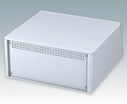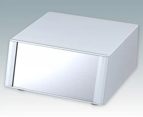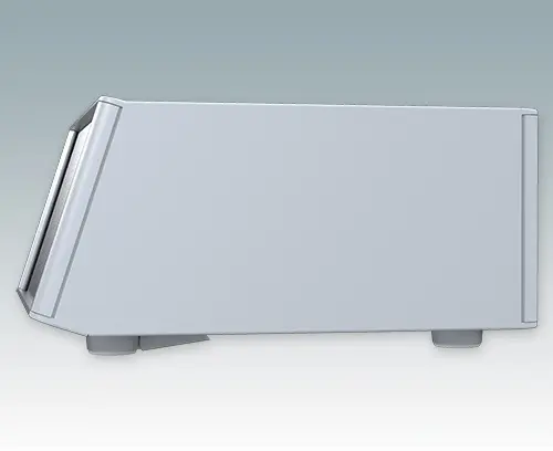 Modern and highly attractive instrument enclosure with sloping front bezel for desktop or portable electronics. Stylish front and rear bezels are fitted to the aluminum case body. Clip-on trims at the front and rear hide the assembly screws and front panel screws, giving a very professional appearance. The pre-assembled internal chassis is supplied with four M3 PCB mounting pillars fitted in the base. The internal chassis can also be fitted with 7 slide-in PCBs using the accessory snap-in guide M6490010 (order 4 guides per PCB). The case is supplied with a rear panel and four ABS feet with tilt legs. Ventilation slots are provided in the base and rear panel. Order front panels separately.