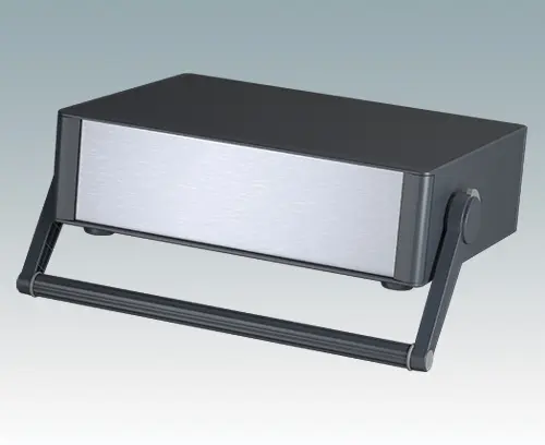 Modern and highly attractive instrument enclosure with handle/bail arm for desktop and portable electronics. Stylish front and rear bezels are fitted to the aluminum case body. Clip-on trims at the front and rear hide the assembly screws and front panel screws, giving a very professional appearance. The handle can be indexed at 30° increments. The pre-assembled internal chassis is supplied with four M3 PCB mounting pillars fitted to the base panel. The internal chassis can also be fitted with 4 slide-in PCBs using the accessory snap-in guide M6490010 (order 4 guides per PCB).