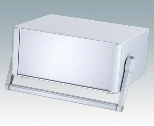 Modern and highly attractive instrument enclosure with handle/bail arm for desktop and portable electronics. Stylish front and rear bezels are fitted to the aluminum case body. Clip-on trims at the front and rear hide the assembly screws and front panel screws, giving a very professional appearance. The handle can be indexed at 30° increments. The pre-assembled internal chassis is supplied with four M3 PCB mounting pillars fitted to the base panel. The internal chassis can also be fitted with 9 slide-in PCBs using the accessory snap-in guide M6490010 (order 4 guides per PCB).