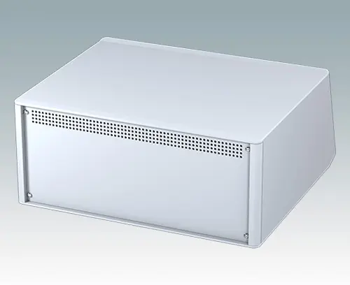 Modern and highly attractive instrument enclosure with sloping front panel for desktop or portable electronics. Stylish front and rear bezels are fitted to the aluminum case body. Clip-on trims at the front and rear hide the assembly screws and front panel screws, giving a very professional appearance. The pre-assembled internal chassis is supplied with four M3 PCB mounting pillars fitted in the base. The internal chassis can also be fitted with 9 slide-in PCBs using the accessory snap-in guide M6490010 (order 4 guides per PCB). The case is supplied with a rear panel and four ABS feet with tilt legs. Ventilation slots are provided in the base and rear panel. Order front panels separately.