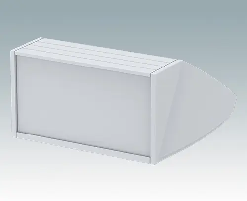 Ergonomic sloping front enclosure for desktop or wall mounted electronics equipment. Pre-assembled aluminum case body with removable base panel. Front aperture for mounting the accessory front panels.  Recessed rear face for mounting switches and power and data connections.