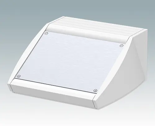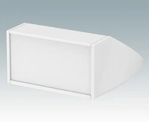 Ergonomic sloping front enclosure for desktop or wall mounted electronics equipment. Pre-assembled aluminum case body with removable base panel. Front aperture for mounting the accessory front panels.  Recessed rear face for mounting switches and power and data connections.