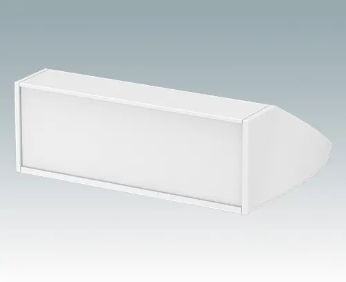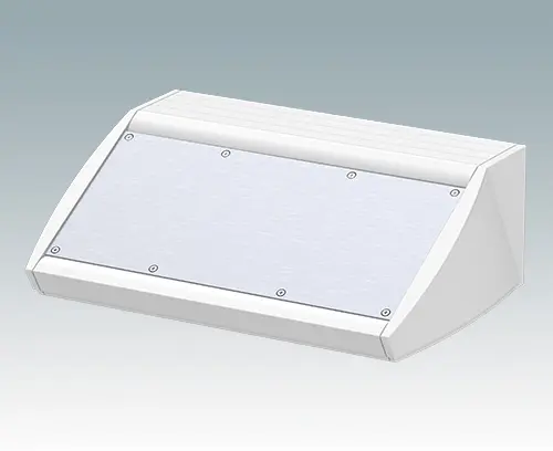 Ergonomic IP 54 rated sloping front enclosure for desktop or wall mounted electronics equipment. Pre-assembled aluminum case body with removable base panel. Front aperture for mounting the accessory front panels. Recessed rear face for mounting switches and power and data connections. To maintain IP 54 rating, fit PCB pillars M5600001, or your own plugs to the mounting holes in the base panel.