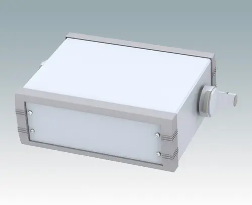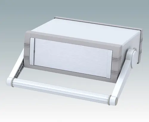 Advanced instrument enclosure with handle/bail arm for desktop and portable electronics. Stylish front and rear bezels are fitted to the fabricated case body. The handle can be indexed at 30° increments.Pre-assembled internal chassis supplied with four snap-in PCB guides. Four standard guide positions - additional positions can be punched on demand. The case is supplied with a rear panel and four non-slip feet. Order front panels separately.