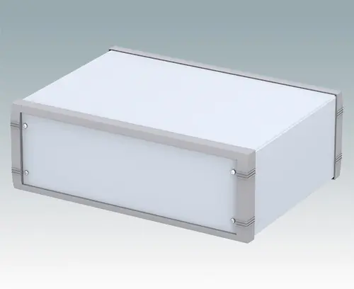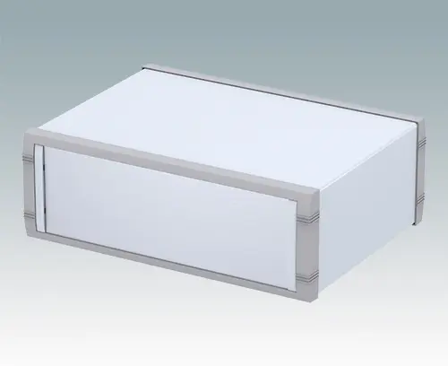Advanced instrument enclosure for desktop electronics. Stylish front and rear bezels are fitted to the fabricated case body. Pre-assembled internal chassis supplied with four snap-in PCB guides. Four standard guide positions - additional positions can be punched on demand. The case is supplied with a rear panel and four non-slip feet. Order front panels separately.