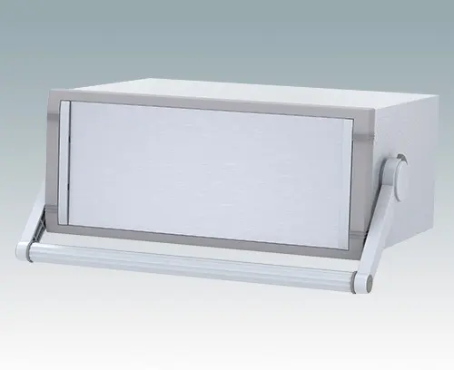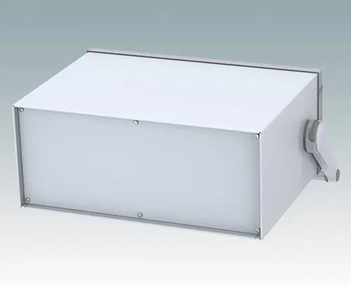 Modern instrument enclosure with handle/bail arm for desktop and portable electronics. Highly attractive die cast front bezel is fitted to the fabricated case body. The handle/bail arm can be indexed at 30° increments.The base and rear panels are removable for easy access. Mounting holes in the base are designed for fitting the accessory PCB pillars. Order the front panel separately.